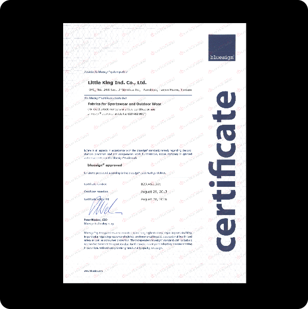 Bluesign® is known as professional system solution for sustainable and safe textile production which eliminates harmful substances across the supply of apparel industry. Little King receives the Bluesign® certification as system partner since 2011.