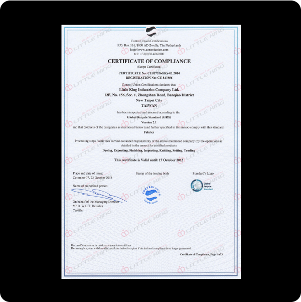 Little King receives the certification as system partner from Bluesign and GRS (Global Recycle Standard) certification since 2011 and 2012 respectively. Both demonstrate our efforts proved in the area of environmental sustainability.