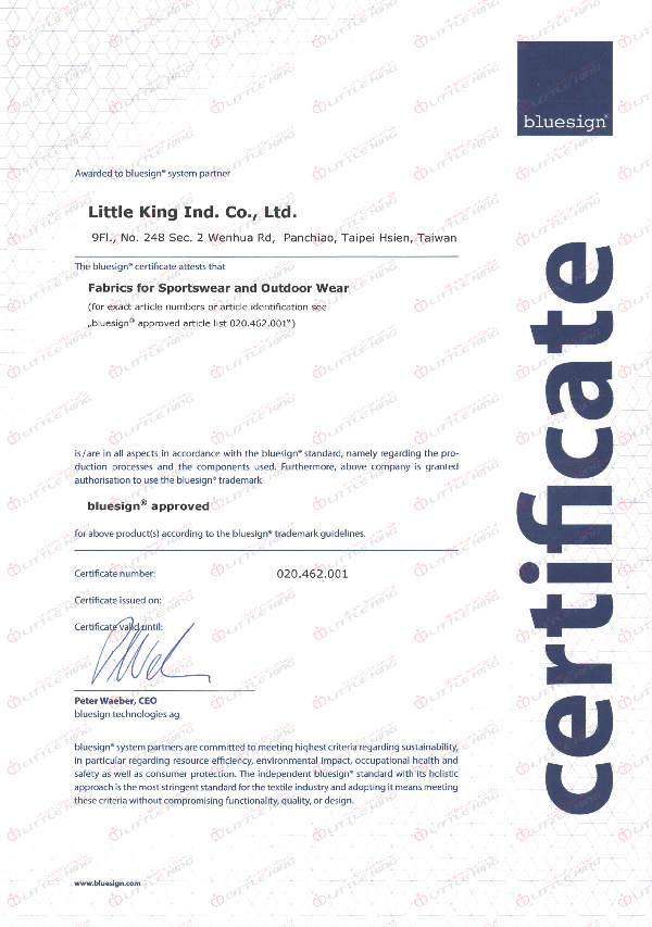 Bluesign® is known as professional system solution for sustainable and safe textile production which eliminates harmful substances across the supply of apparel industry. Little King receives the Bluesign® certification as system partner since 2011.