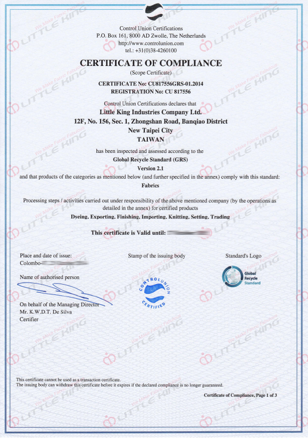 Little King receives the certification as system partner from Bluesign and GRS (Global Recycle Standard) certification since 2011 and 2012 respectively. Both demonstrate our efforts proved in the area of environmental sustainability.